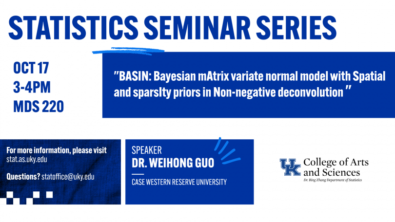Abstract: Spatial transcriptomics allows researchers to visualize and analyze gene expression within the precise location of tissues or cells. It provides spatially resolved gene expression data but often lacks cellular resolution, necessitating cell type deconvolution to infer cellular composition at each spatial location. In this paper we propose BASIN for cell type deconvolution, which models deconvolution as a nonnegative matrix factorization (NMF) problem incorporating graph Laplacian prior. Rather than find a deterministic optima like other recent methods, we propose a matrix variate Bayesian NMF method with nonnegativity and sparsity priors, in which the variables are maintained in their matrix form to derive a more efficient matrix normal posterior. BASIN employs a Gibbs sampler to approximate the posterior distribution of cell type pro- portions and other parameters, offering a distribution of possible solutions, enhancing robustness and providing inherent uncertainty quantification. The performance of BASIN is evaluated on different spatial transcriptomics datasets and outperforms other deconvolution methods in terms of accuracy and efficiency. The results also show the effect of the incorporated priors and reflect a truncated matrix normal distribution as we expect. This is a joint work with Jiasen Zhang (CWRU Math PhD student) and Liangliang Zhang (CWRU Biostatistics faculty).